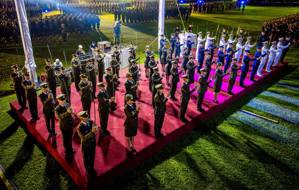 El acto protocolario fue presidido por el señor Ministro de la Defensa Nacional, Vicealmirante René Francis Merino Monroy, quien entregó personalmente el Sable y la Espada a los recién graduados. Estos símbolos representan el mando y liderazgo que guiarán la carrera militar de los nuevos oficiales.