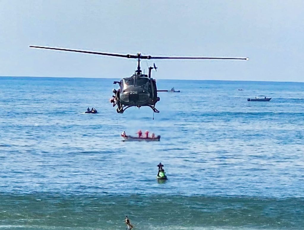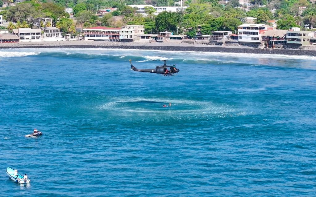 La Fuerza Aérea de El Salvador, también tuvo participación en un simulacro de rescate acuático con un helicóptero UH-1H, en el que guardavidas efectuaron la extracción de una víctima en aguas profundas mientras socorristas brindaban atención prehospitalaria en la orilla.